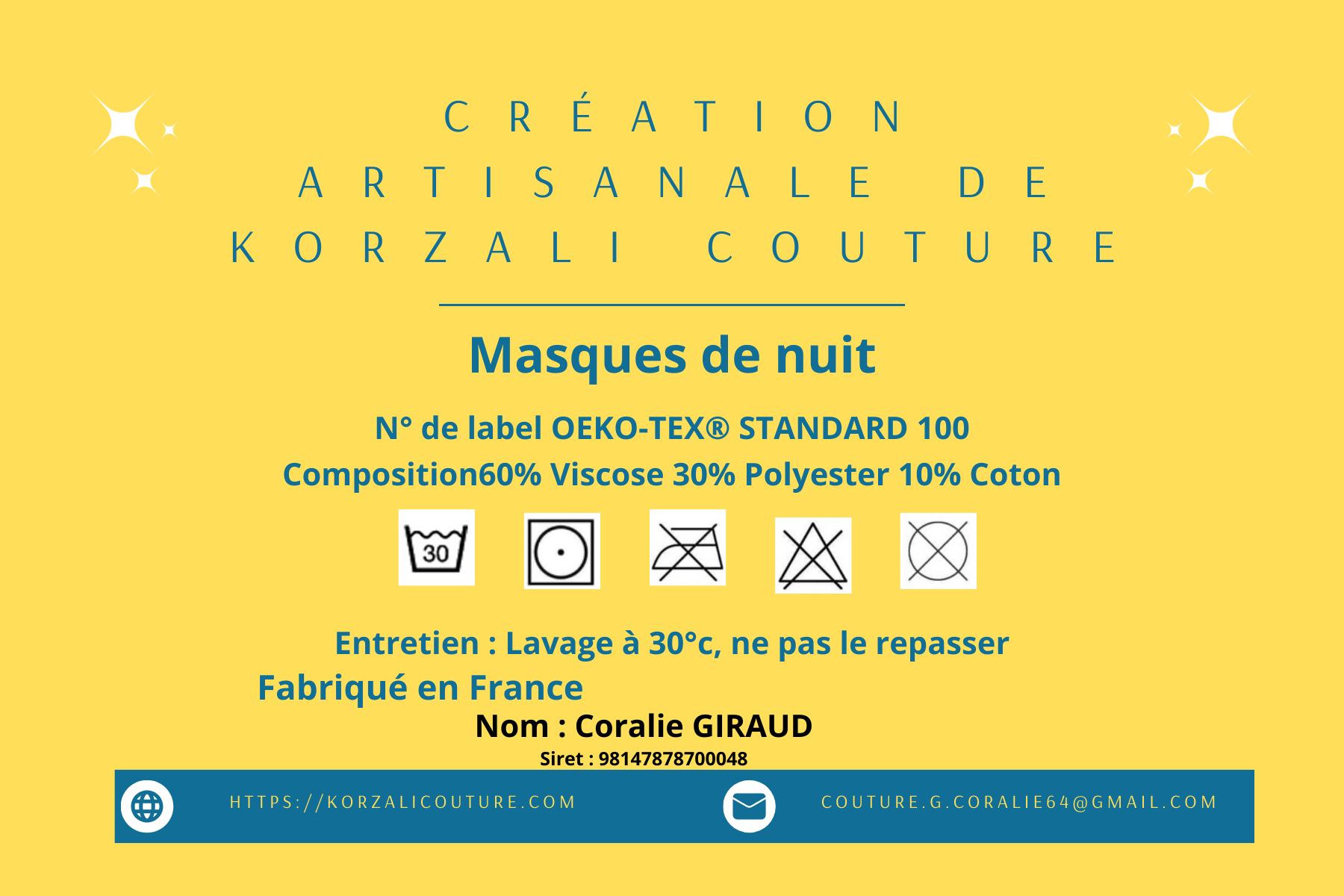 Artisan couturière engagée, je conçois et fabrique des masques de nuit écologiques, pensés pour votre confort tout en respectant la planète. Dans mon atelier, chaque pièce est réalisée à la main avec soin, en privilégiant des matériaux durables : tissus naturels, coton biologique certifié, fibres recyclées ou encore textiles issus de la récupération afin de limiter le gaspillage.